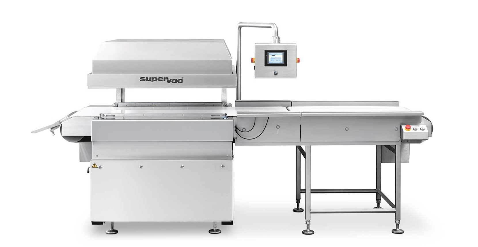 The Supervac conveyorised stainless steel high output vacuum packaging machine increase output from only one operator. Made of high quality stainless steel for ease of cleaning and maximum hygiene. For food such as meat and meat products, fish, cheese and all other food and non-food products.